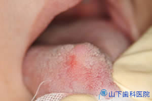 | 舌のしこりを悪性の腫瘍ができたのではと、とても心配して来院されました。視診、触診、経過等の問診から悪性の可能性はとても低いと思われました。臨床的な印象では良性線維腫。それでも、特殊な軟部腫瘍が口腔内にもできる例や、非常に希ですが他の部位の悪性腫瘍の転移病巣の可能性も念頭に置き、全摘して病理組織診断による確定が必要とお話しました。 | ![]() |