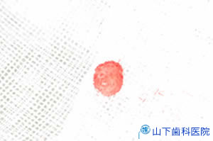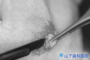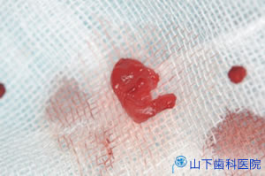 | 当院での摘出と医科検査所での病理組織検査を希望されましたので、歯科用局所麻酔の下、一塊に摘出しました。軟組織の処置のスムースな進行は、層を確認できる術野を確保してくれるアシスト(助手)の技術があって可能になります。声も聞こえます。患者さんの不安な心を支える声かけは技術以上に大切です。 | ![]() |