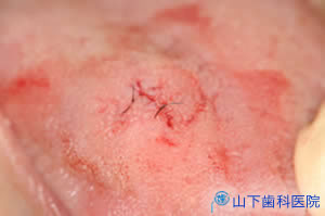 | 摘出によってできた創を細めのナイロン糸で縫合します。舌はよく動くので、深くつかみ、動いてもほどけないような結び方をしてします。 | ![]() |