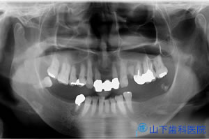 | 骨の無菌的再生治癒を待っている期間のオルソパントモレントゲン像です。 | ![]() |