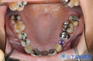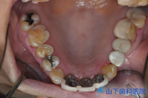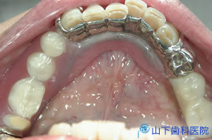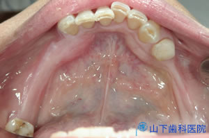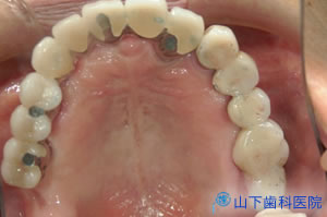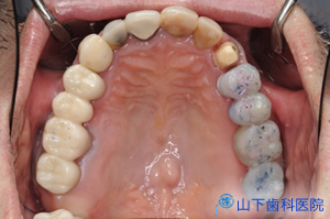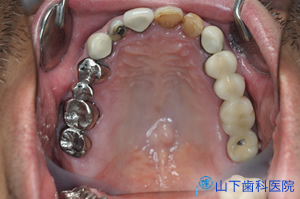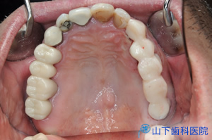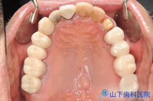 | 上顎の残っている歯すべてに金属製の内冠または沈下を抑える根面板を被せています。 | ![]() |