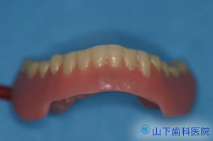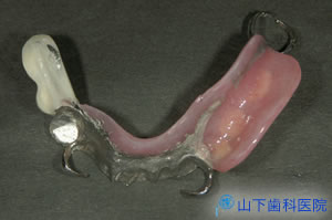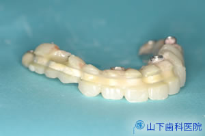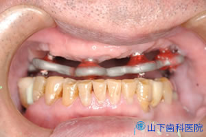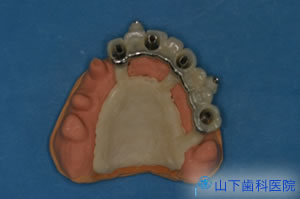 | 奥歯の沈み込みを抑えて前歯の崩壊を防ぎ、インプラントを埋入した部位の粘膜の損傷を和らげ、治療中もそれなりに噛む工夫をこらした「入れ歯」を作りました。 | ![]() |