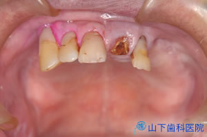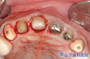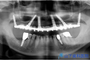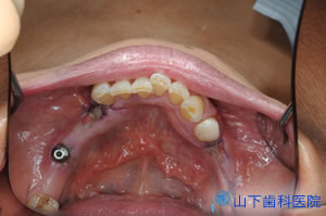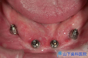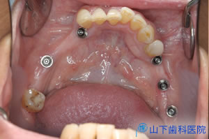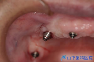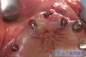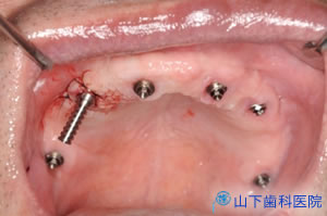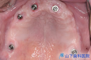 幸い4本の長いインプラント体を馬蹄形にほぼ均等配置でき、仮の構造物をすべてレジンでつなげて咬合力を分散させて横揺れが起こりにくい状態を保つことができたので、埋入して4か月待つとインプラント体が骨結合していました。左上一番奥の歯は抜歯しました。