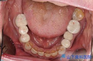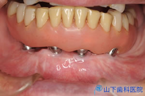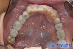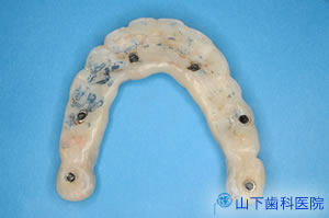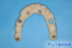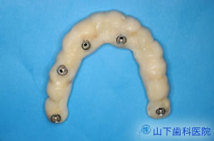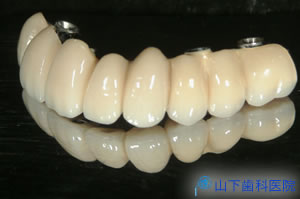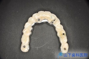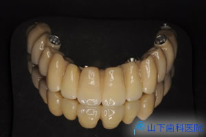 | 下顎はネジ止め固定式の上部構造体インプラントブリッジ(人工歯冠)を作製。 | ![]() |