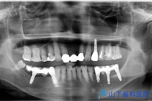 右下奥歯2本はもっと以前に失い、インプラント修復しています。その効果の大きさを経験してご理解なさっていたことから、上の欠損修復もインプラント治療を提案し、是非お願いしたいとのことでこの治療になりました。大変満足され、以後、残した上顎の歯は今も持っています。インプラント治療した部位は上も下も何も問題がありません。