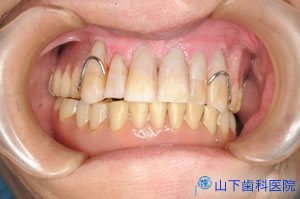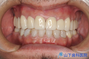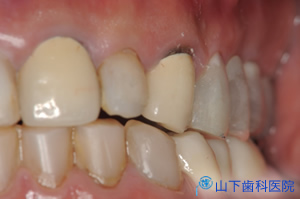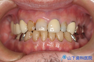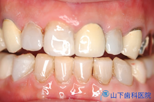 | 前歯のブリッジは、下から付き上げを食らわず、ぐらつかなくなりました。露出した歯根をコンポジットレジンでマスキングして経過を診ています。 | ![]() |