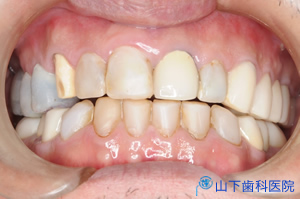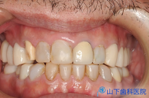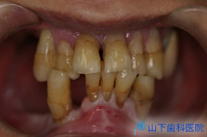 | 初診時正面観 すでに抜歯された部分は前後の歯を削って冠を被せるブリッジ、それができない最後臼歯の欠損は放置、それ以外に残るすべての歯に何らかの治療がなされています。保険の銀歯もあれば、保険が効かないセラミックで化粧した金属冠のメタルボンド(さし歯)もあり、 プラスチックの詰めもの(コンポジットレジン)はどれも茶色く変色しています。 |