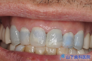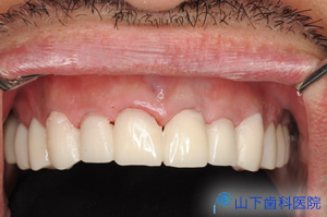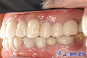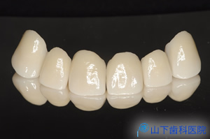 | 完成した6前を歯質とジルコニアとを接着させる接着システムを用いてセットしました。 下顎前歯部は全く歯質を削らず、変色しにくいコンポジットレジンを盛り上げて色調を合わせました。 内部に古い土台の金属を残した歯が数本ありますが、口腔に露出する部分には金属が全くないメタルフリーの修復になりました。 |