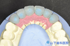 | 精密な型取り、咬み合せ取りを行って、できた作業模型(シリコンガム付き)の上で、歯科技工士が上顎6前歯のレジン製のモックアップ単独冠を作りました。 | ![]() |