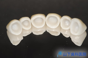 | 右上奥のジルコニアブリッジも完成しました。 これで臼歯部の修復が終わり、前歯部6本の修復に入ります。 |