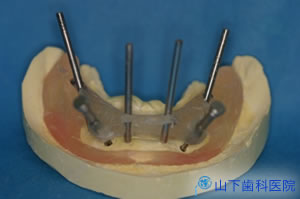| しばらくはこのような5点で支える状態なります。 5カ所で支えている間は、たわんで破折する、一部のインプラント体に過剰な力が集中するなど、避けるべき事があります。腰のあるものを咬まないようお願いしました。 |