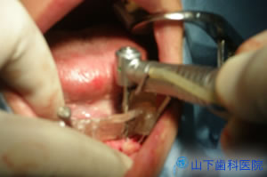 | カバースクリューの上から粘膜骨膜を縫合して閉鎖創にします。 | ![]() |