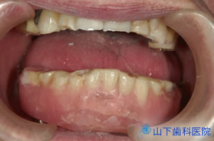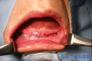 | それでも傷が開くことがあるので出来るだけ入れ歯は使わないようにして頂きました。 下の総入れ歯は、どのみちまともに噛めないから、外したままでも大して変わらないと理解して頂けました。こうした状況で2か月間過ごして頂きました。 自宅での食事指導、治癒を助けるアミノ酸配合の栄養補助剤も併用しました。 |
