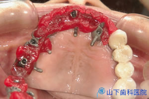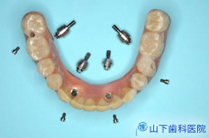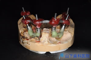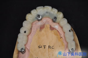 | 左上の3つは内冠が被さった歯、右上から左上前にかけては4つのインプラントに取り付けたマルチユニットアバットメント(最前の1つは角度付き)が見えます。 | ![]() |