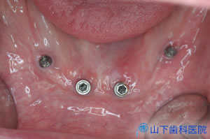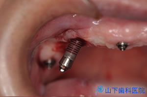 | 下顎のインプラントは頭出しをした後に、マルチユニットアバットメントと呼ぶ粘膜貫通部の閉鎖保護機能に優れる既成アバットメントを取り付けました。 現在残っている前方部の歯が将来すべて失われても、あとインプラントを1~2本追加するだけでフルブリッジに移行できます。 |