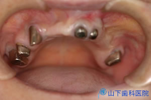 70代始めの男性。15年以上前に上の両側奥歯をすべて失い、上あごの中央をくり抜いた私費の金属床を入れて頂いていました。下は7~8年前に左右1本ずつ奥歯が欠損し単独歯インプラントで修復しています。