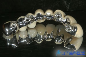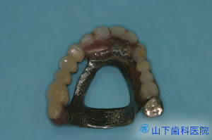 | 外冠が付いている「入れ歯」は味覚を落とさないよう、口蓋を中抜きした金属床です。 | ![]() |