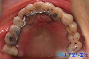 | 原因は仮の上部構造体のレジン部分の破折でした。口蓋側だけに入れた金属補強では強度不足だったようです。 | ![]() |