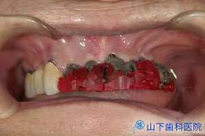 | 咬み合せ記録は、仮着に使う赤いパターンレジンで仮着と同時に採りました。 当時は、CAD/CAM技術も、ジルコニアのように金属並みの強度を持つセラミック素材で大型ブリッジを作る技術もまだありませんでした。高温で金属を溶かし、ワックスで作った歯型を埋め込んだ鋳型のワックスを蒸発させた隙間に鋳込むロストワックス鋳造法があるだけです。 従来からあるこの方法は、冷えて固まる際の収縮が大きく、数カ所の支台(この症例ではインプラント体に付けたアバットメント)のすべてに精密に適合する長い大型ブリッジを一気に作ることができません。一つ一つの支台に適合する短い部分を作り、口の中の支台にすべて止めてパターンレジンで仮着します。これを一塊に取り出して、口蓋側に付与した固定用突起を含めてロー着用埋没剤に埋めます。 パターンレジンを蒸散させてできる隙間にロー着用金属を高温で溶して流すロー着操作を行い、冷えてから突起を切断すると、鋳造収縮による誤差が補正された長い大型ブリッジの金属骨格が完成します。 |