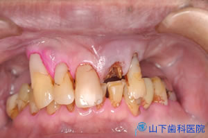 | 歯周病が相当進んでいるように見られます。本来ならば骨の中、歯肉の下に隠れて見えない歯根が広く露出しています。その根の周囲にぐるりと「むし歯」ができ、プラスチック(コンポジットレジン)が詰まっています。下の残っている歯はすべてぐらぐらで、それに突き上げを食らう上の前歯は前に飛び出しています。 | ![]() |
