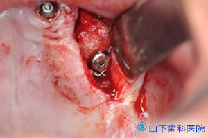 | 5か月待って再埋入可能と判断、全くドリリングせずにインプラント体が持つセルフタップ機能だけで新しいインプラント体を埋入しました。 仮の上部構造体にはつなげず、粘膜骨膜の下に埋め込む2回法にしました。 剥離した粘膜骨膜の下に見えているのは、インプラント体内部に設置されているネジ穴を塞ぐために頭部に付けたカバースクリューです。 |