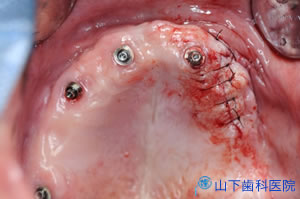 | 4本の長いブローネマルクインプラントを埋入、縫合した直後の状態です。 骨が軟らかく、上の歯が咬みこんで起こる微小動揺によって、互いに強固のつなぎ止めても、全体がゆさぶられるて骨結合しないリスクが高いと判断、即時負荷は避けました。 切開縫合した創が閉じて、しっかりした粘膜で覆われるまでの期間、入れ歯の底を削って軟らかい裏打ち材料(ティッシューコンディショナー)を貼り、硬くなってきたら貼り替えます。 |