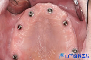 | 内冠部分に外冠ブリッジをはめ込み、インプラント部分に上部構造体をネジ止め固定した状態です。口蓋は完全に開放され、もはや入れ歯ではなくなりました。 | ![]() |